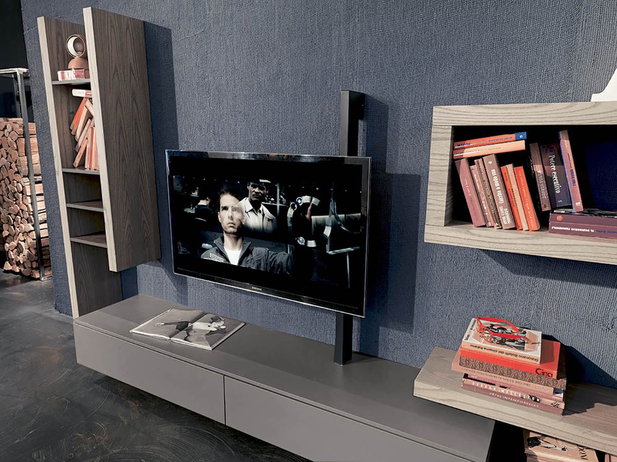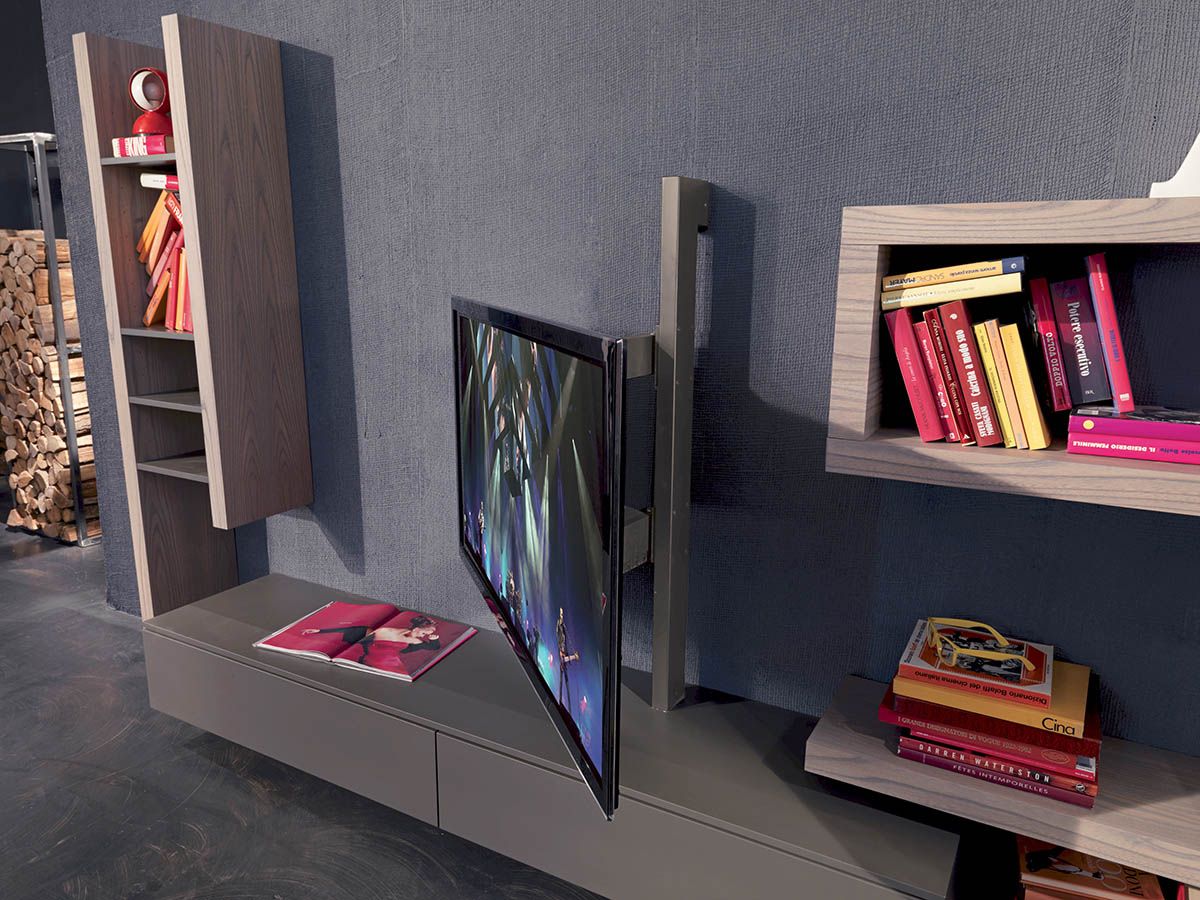 Il nuovo programma Side System si evolve verso tematiche progettuali inedite e assolutamente originali rispetto ai “normali” prodotti per l’arredamento del living. Il mobile in showroom ha la particolarità di avere il pannello girevole porta tv, completo di impianto audio integrato ed il sistema Bluetooth che permette di interfacciare smart phone, tablet, ecc..